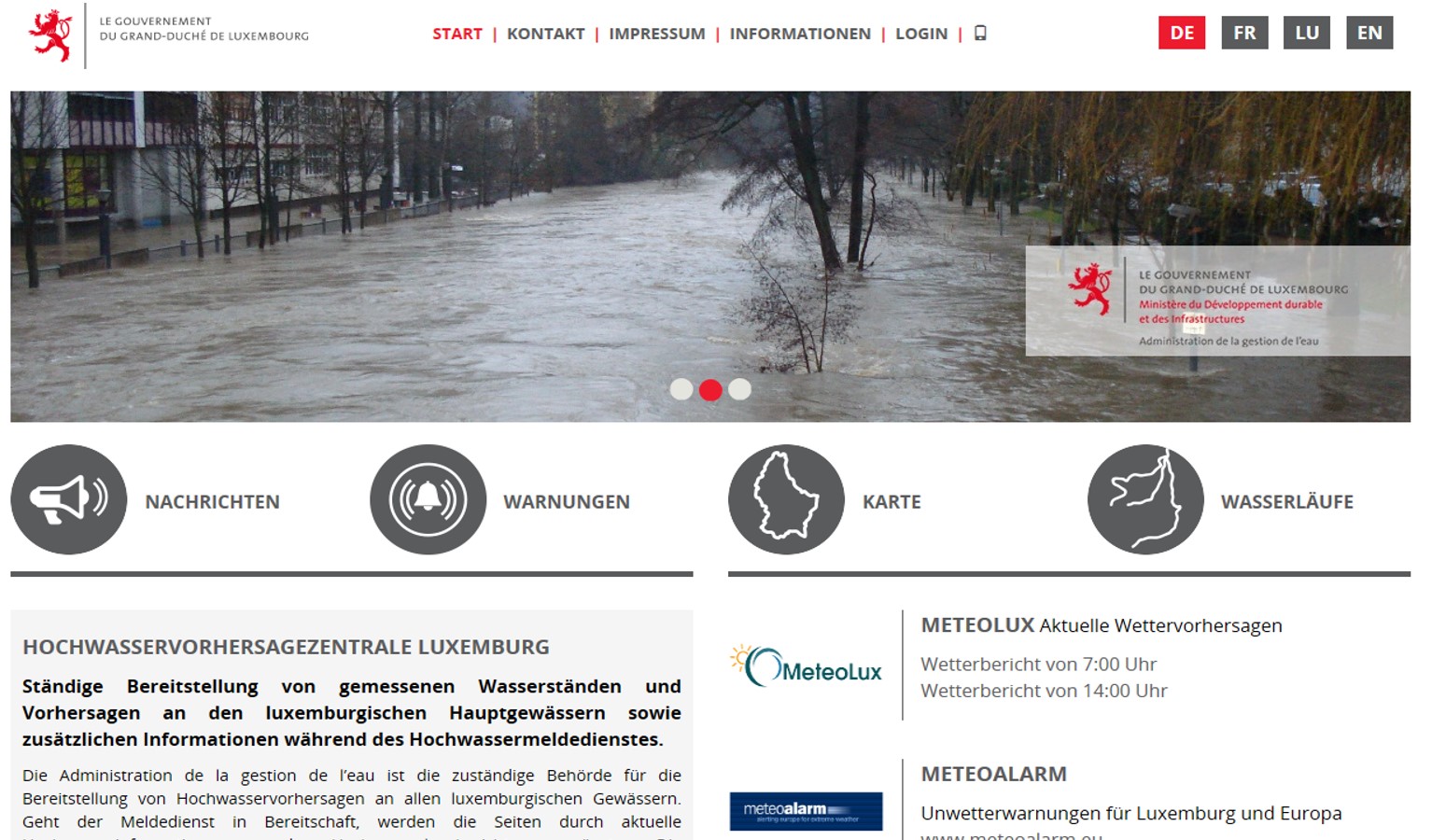 Die Internetseite stellte schon immer kontinuierlich gemessene Wasserstände und Vorhersagen, sowie zusätzliche Informationen während der Hochwassersituation an luxemburgischen Flüssen zur Verfügung.