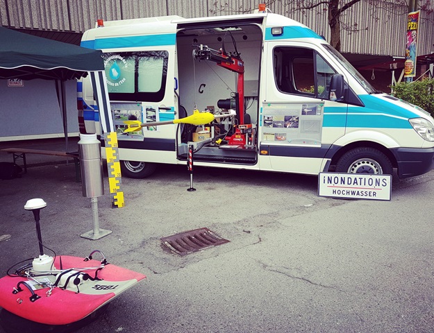 Der Service hydrométrie nahm die Gelegenheit wahr, über seine verschiedenen Messinstrumente zu informieren, die an der Basis einer zuverlässigen Hochwasservorhersage stehen. So konnten die Besucher diverse Flügel, ADCP-Boote und die Auswerttechnik bewundern. Am meisten Blicke zog jedoch der „Saumon“ auf sich, der in einem ausgemusterten Krankenwagen installiert ist. Dieser 50 kg schwere Flügel kommt nur im außergewöhnlichen Hochwasserfall zum Einsatz. Anwesend waren auch Mitarbeiter der groupe pollution der Administration de la gestion de l’eau, die über ihre Aufgabenbereiche informiert haben.